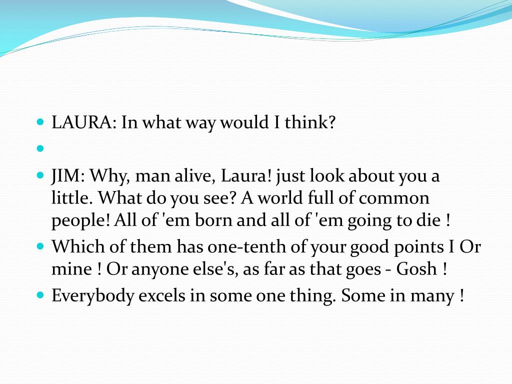 LAURA: In what way would I think? • JIM: Why, man alive, Laura! just look about you a little. What do you see? A world full of common people! All of 'em born and all of 'em going to die ! • Which of them has one-tenth of your good points I Or mine ! Or anyone else's, as far as that goes - Gosh ! • Everybody excels in some one thing. Some in many !