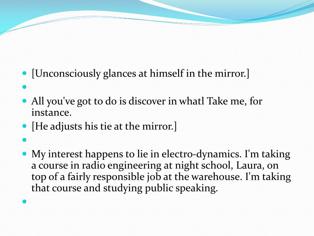 [Unconsciously glances at himself in the mirror.] • All you've got to do is discover in whatl Take me, for instance. • [He adjusts his tie at the mirror.] • My interest happens to lie in electro-dynamics. I'm taking a course in radio engineering at night school, Laura, on top of a fairly responsible job at the warehouse. I'm taking that course and studying public speaking.