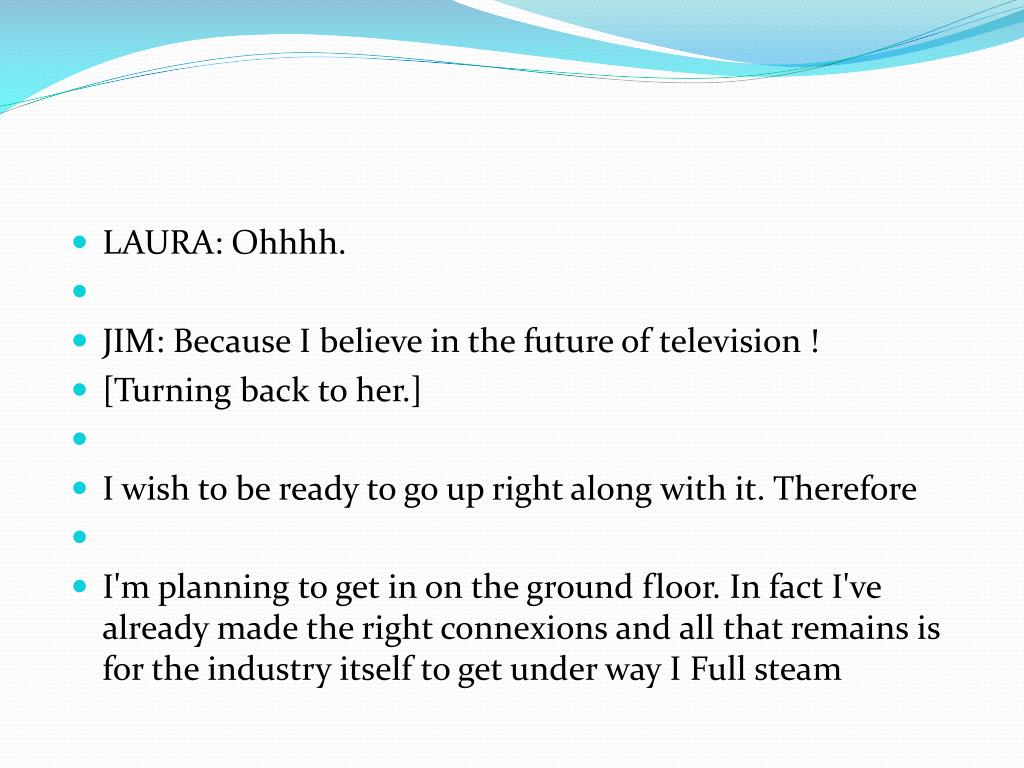 LAURA: Ohhhh. • JIM: Because I believe in the future of television ! • [Turning back to her.] • I wish to be ready to go up right along with it. Therefore • I'm planning to get in on the ground floor. In fact I've already made the right connexions and all that remains is for the industry itself to get under way I Full steam