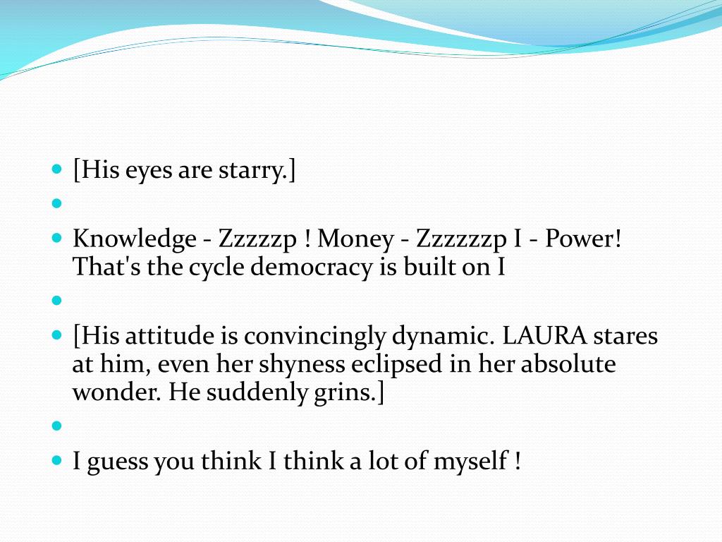 [His eyes are starry.] • Knowledge - Zzzzzp ! Money - Zzzzzzp I - Power! That's the cycle democracy is built on I • [His attitude is convincingly dynamic. LAURA stares at him, even her shyness eclipsed in her absolute wonder. He suddenly grins.] • I guess you think I think a lot of myself !