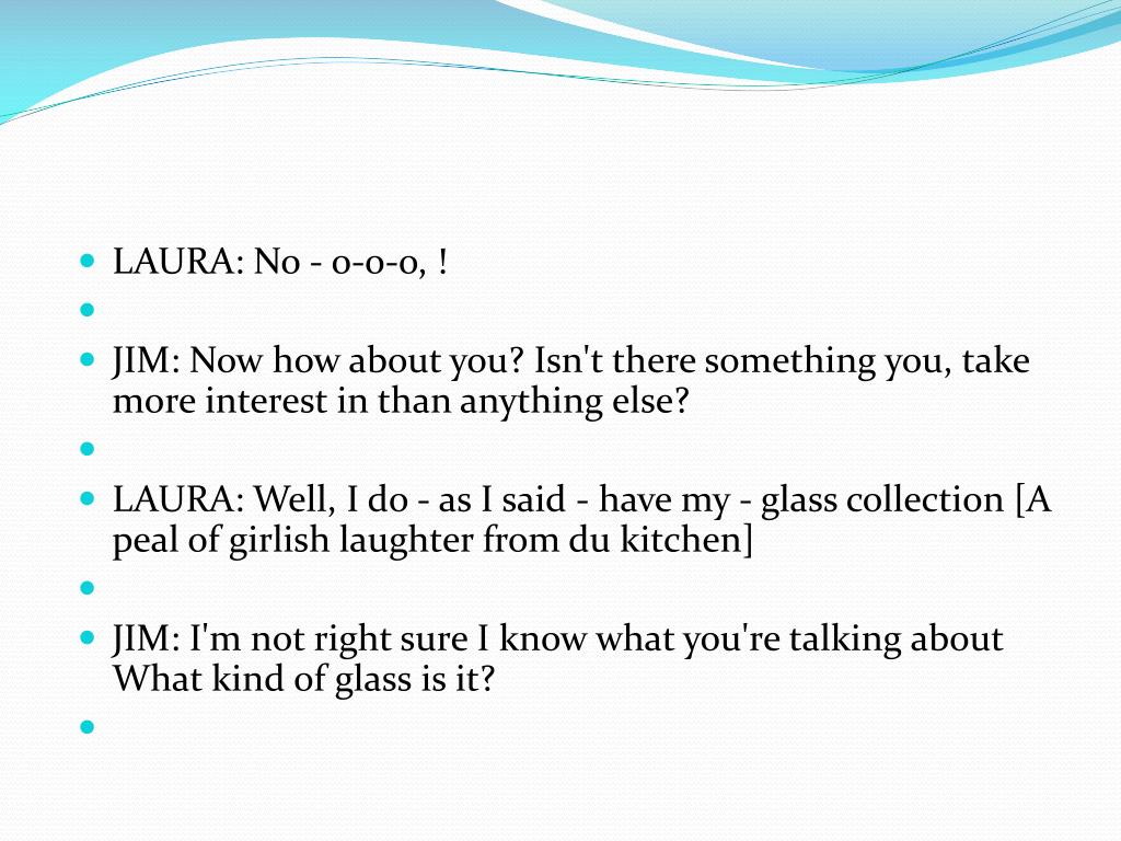 LAURA: No - o-o-o, ! • JIM: Now how about you? Isn't there something you, take more interest in than anything else? • LAURA: Well, I do - as I said - have my - glass collection [A peal of girlish laughter from du kitchen] • JIM: I'm not right sure I know what you're talking about What kind of glass is it?