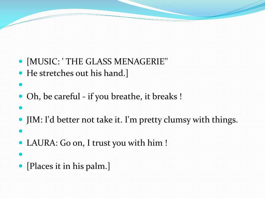 [MUSIC: ' THE GLASS MENAGERIE'' • He stretches out his hand.] • Oh, be careful - if you breathe, it breaks ! • JIM: I'd better not take it. I'm pretty clumsy with things. • LAURA: Go on, I trust you with him ! • [Places it in his palm.]