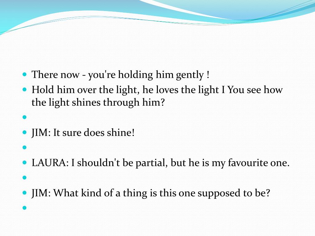 JIM: There you go, that inferiority stuff ! Come on, try ! • LAURA: Oh, but I'd step on you ! • JIM: I'm not made out of glass. • LAURA: How - how - how do we start? • J IM: just leave it to me. You hold your arms out a little. • LAURA: Like this?