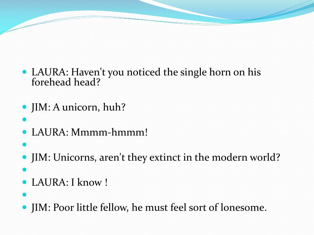 LAURA: Haven't you noticed the single horn on his forehead head? • JIM: A unicorn, huh? • LAURA: Mmmm-hmmm! • JIM: Unicorns, aren't they extinct in the modern world? • LAURA: I know ! • JIM: Poor little fellow, he must feel sort of lonesome.