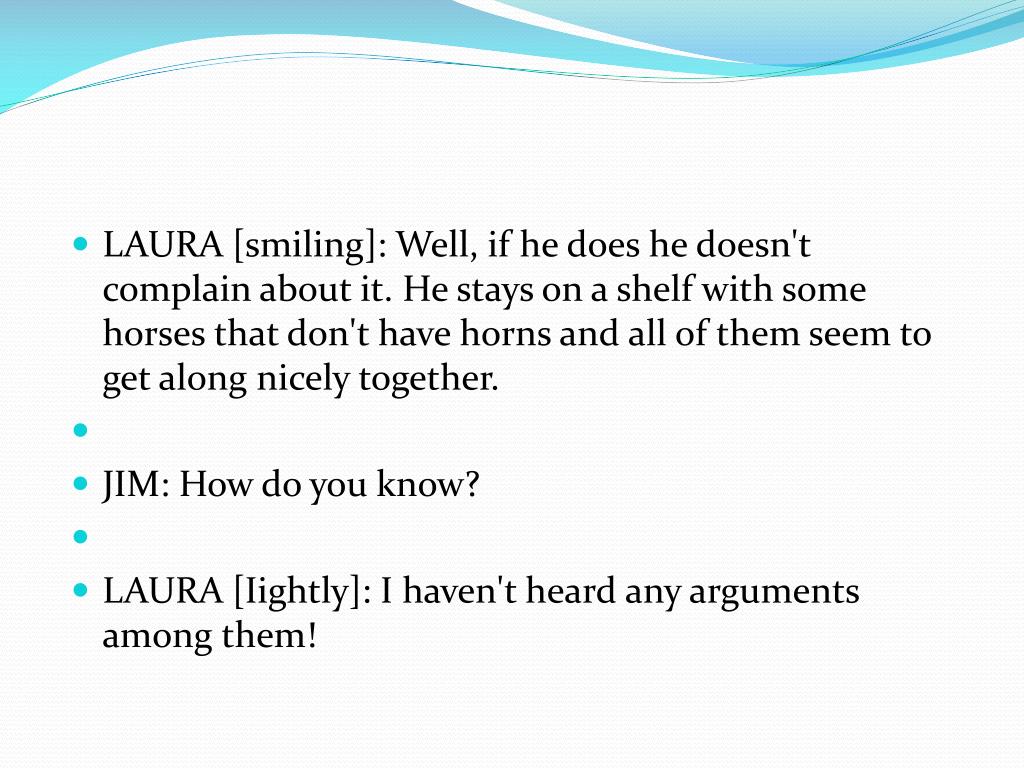 LAURA [smiling]: Well, if he does he doesn't complain about it. He stays on a shelf with some horses that don't have horns and all of them seem to get along nicely together. • JIM: How do you know? • LAURA [Iightly]: I haven't heard any arguments among them!