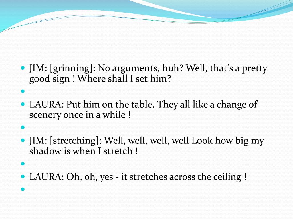 JIM: [grinning]: No arguments, huh? Well, that's a pretty good sign ! Where shall I set him? • LAURA: Put him on the table. They all like a change of scenery once in a while ! • JIM: [stretching]: Well, well, well, well Look how big my shadow is when I stretch ! • LAURA: Oh, oh, yes - it stretches across the ceiling !