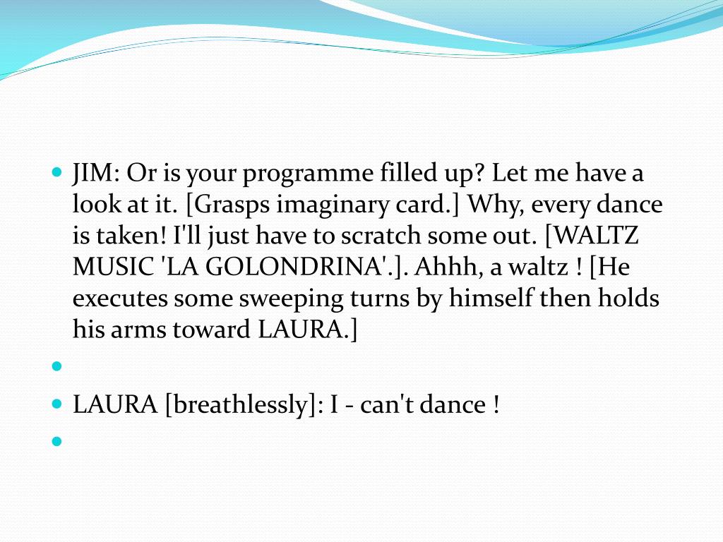 JIM: Or is your programme filled up? Let me have a look at it. [Grasps imaginary card.] Why, every dance is taken! I'll just have to scratch some out. [WALTZ MUSIC 'LA GOLONDRINA'.]. Ahhh, a waltz ! [He executes some sweeping turns by himself then holds his arms toward LAURA.] • LAURA [breathlessly]: I - can't dance !