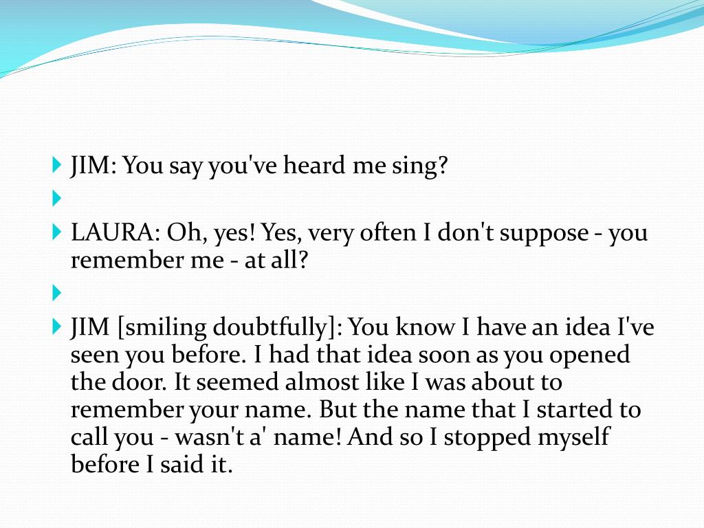 JIM: You say you've heard me sing? • LAURA: Oh, yes! Yes, very often I don't suppose - you remember me - at all? • JIM [smiling doubtfully]: You know I have an idea I've seen you before. I had that idea soon as you opened the door. It seemed almost like I was about to remember your name. But the name that I started to call you - wasn't a' name! And so I stopped myself before I said it.