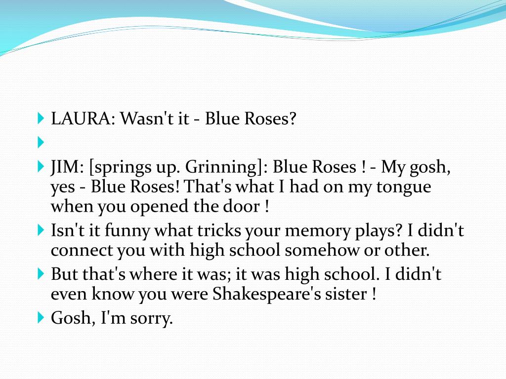 LAURA: Wasn't it - Blue Roses? • JIM: [springs up. Grinning]: Blue Roses ! - My gosh, yes - Blue Roses! That's what I had on my tongue when you opened the door ! • Isn't it funny what tricks your memory plays? I didn't connect you with high school somehow or other. • But that's where it was; it was high school. I didn't even know you were Shakespeare's sister ! • Gosh, I'm sorry.