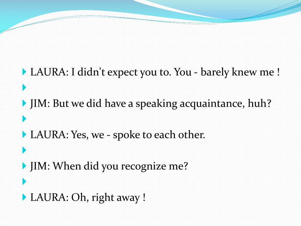 LAURA: I didn't expect you to. You - barely knew me ! • JIM: But we did have a speaking acquaintance, huh? • LAURA: Yes, we - spoke to each other. • JIM: When did you recognize me? • LAURA: Oh, right away !