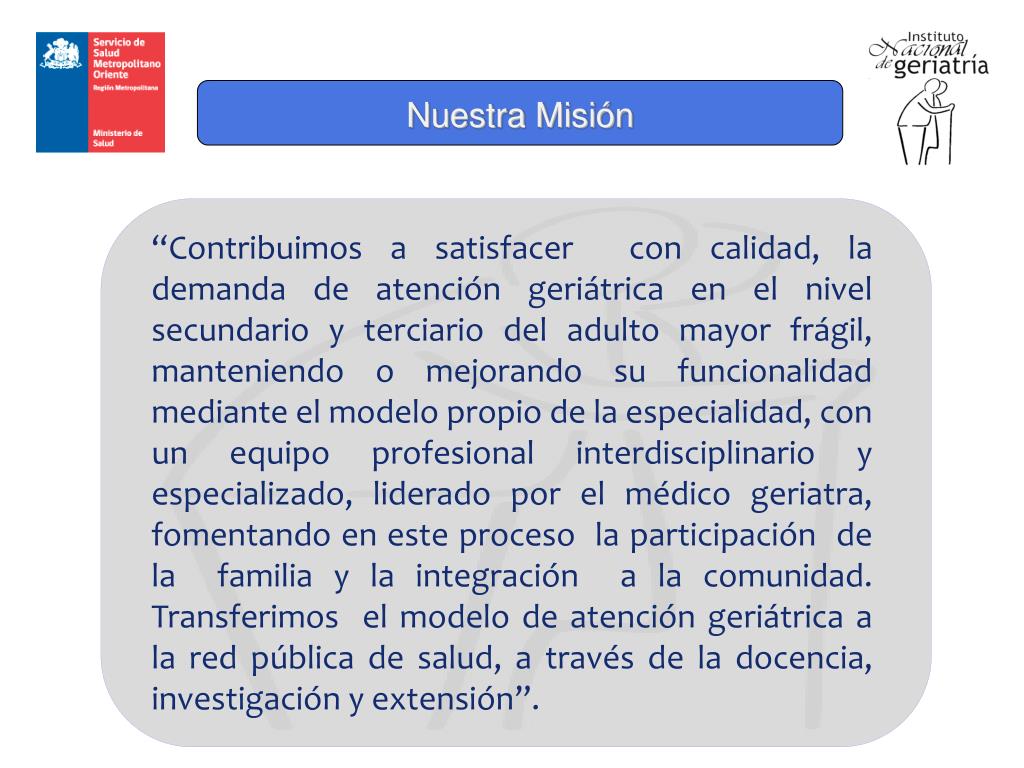 Nuestra Misión “Contribuimos a satisfacer con calidad, la demanda de atención geriátrica en el nivel secundario y terciario del adulto mayor frágil, manteniendo o mejorando su funcionalidad mediante el modelo propio de la especialidad, con un equipo profesional interdisciplinario y especializado, liderado por el médico geriatra, fomentando en este proceso la participación de la familia y la integración a la comunidad. Transferimos el modelo de atención geriátrica a la red pública de salud, a través de la docencia, investigación y extensión”.
