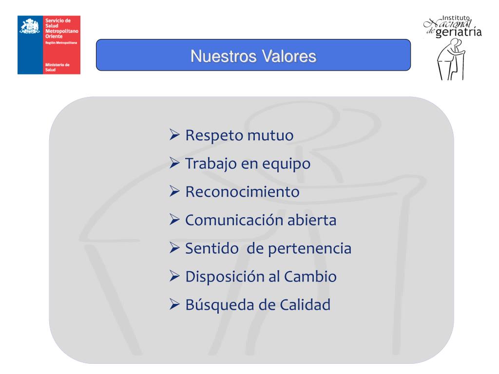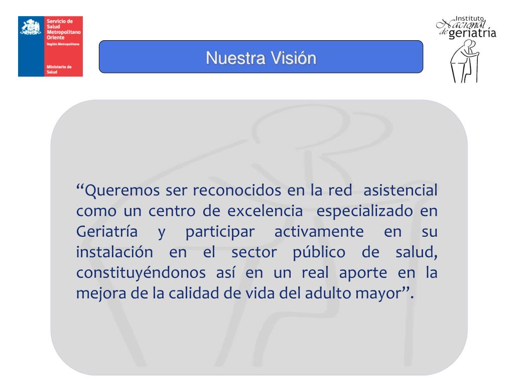 Nuestra Visión “Queremos ser reconocidos en la red asistencial como un centro de excelencia especializado en Geriatría y participar activamente en su instalación en el sector público de salud, constituyéndonos así en un real aporte en la mejora de la calidad de vida del adulto mayor”.