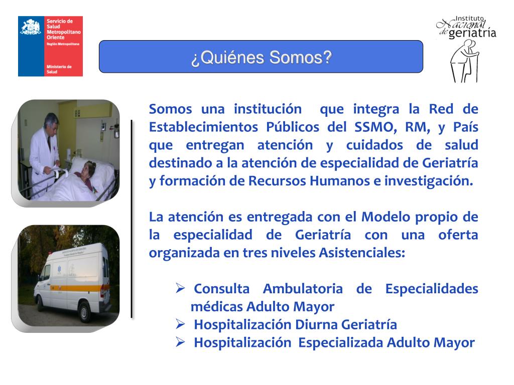 ¿Quiénes Somos? Somos una institución que integra la Red de Establecimientos Públicos del SSMO, RM, y País que entregan atención y cuidados de salud destinado a la atención de especialidad de Geriatría y formación de Recursos Humanos e investigación. La atención es entregada con el Modelo propio de la especialidad de Geriatría con una oferta organizada en tres niveles Asistenciales: • Consulta Ambulatoria de Especialidades médicas Adulto Mayor • Hospitalización Diurna Geriatría • Hospitalización Especializada Adulto Mayor