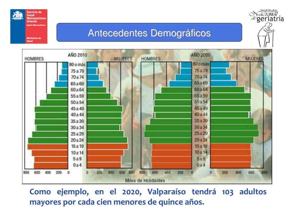 Antecedentes Demográficos Como ejemplo, en el 2020, Valparaíso tendrá 103 adultos mayores por cada cien menores de quince años.