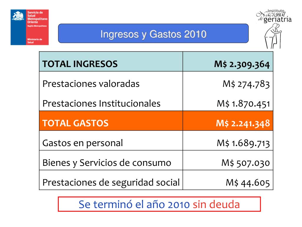 Ingresos y Gastos 2010 Se terminó el año 2010 sin deuda