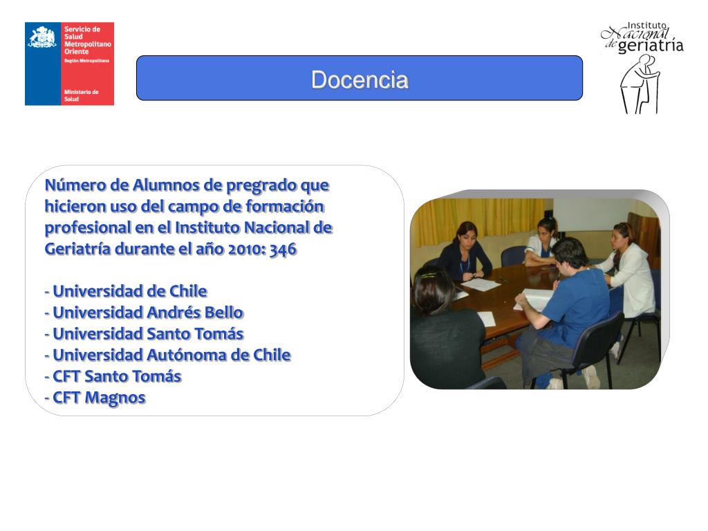 Docencia Número de Alumnos de pregrado que hicieron uso del campo de formación profesional en el Instituto Nacional de Geriatría durante el año 2010: 346 • Universidad de Chile • Universidad Andrés Bello • Universidad Santo Tomás • Universidad Autónoma de Chile • CFT Santo Tomás • CFT Magnos