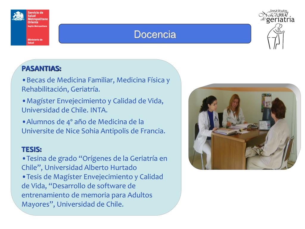 Docencia PASANTIAS: • Becas de Medicina Familiar, Medicina Física y Rehabilitación, Geriatría. • Magíster Envejecimiento y Calidad de Vida, Universidad de Chile. INTA. • Alumnos de 4º año de Medicina de la Universite de Nice Sohia Antipolis de Francia. TESIS: • Tesina de grado “Orígenes de la Geriatría en Chile”, Universidad Alberto Hurtado • Tesis de Magíster Envejecimiento y Calidad de Vida, “Desarrollo de software de entrenamiento de memoria para Adultos Mayores”, Universidad de Chile.