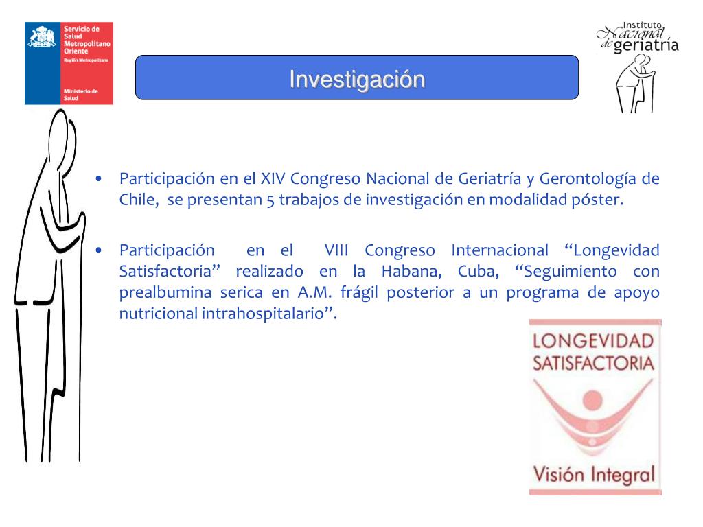 Investigación • Participación en el XIV Congreso Nacional de Geriatría y Gerontología de Chile, se presentan 5 trabajos de investigación en modalidad póster. • Participación en el VIII Congreso Internacional “Longevidad Satisfactoria” realizado en la Habana, Cuba, “Seguimiento con prealbumina serica en A.M. frágil posterior a un programa de apoyo nutricional intrahospitalario”.