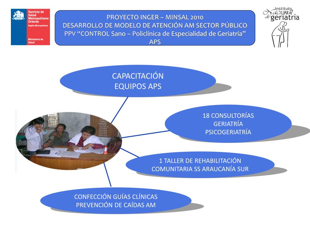 CAPACITACIÓN EQUIPOS APS 18 CONSULTORÍAS GERIATRÍA PSICOGERIATRÍA 1 TALLER DE REHABILITACIÓN COMUNITARIA SS ARAUCANÍA SUR CONFECCIÓN GUÍAS CLÍNICAS PREVENCIÓN DE CAÍDAS AM PROYECTO INGER – MINSAL 2010DESARROLLO DE MODELO DE ATENCIÓN AM SECTOR PÚBLICOPPV “CONTROL Sano – Policlínica de Especialidad de Geriatría” APS