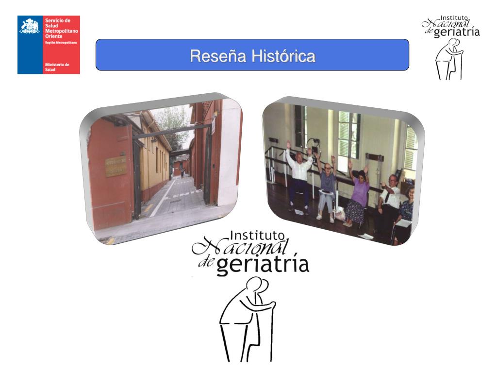 Reseña Histórica Reseña Histórica 1976 se crea como Centro Geriátrico. 1984 el Servicio de Salud Metropolitano Oriente (SSMO) le da el carácter de Centro Especializado de atención de salud para la población Adulto Mayor. 1997, se le reconoce como establecimiento de especialidad y que forma recursos humanos recibiendo el nombre de Instituto Nacional de Geriatría (INGER). 1999, el INGER establecimiento único en su especialidad y de cobertura nacional pasa a llamarse “Instituto Nacional de Geriatría, Presidente Eduardo Frei Montalva”.