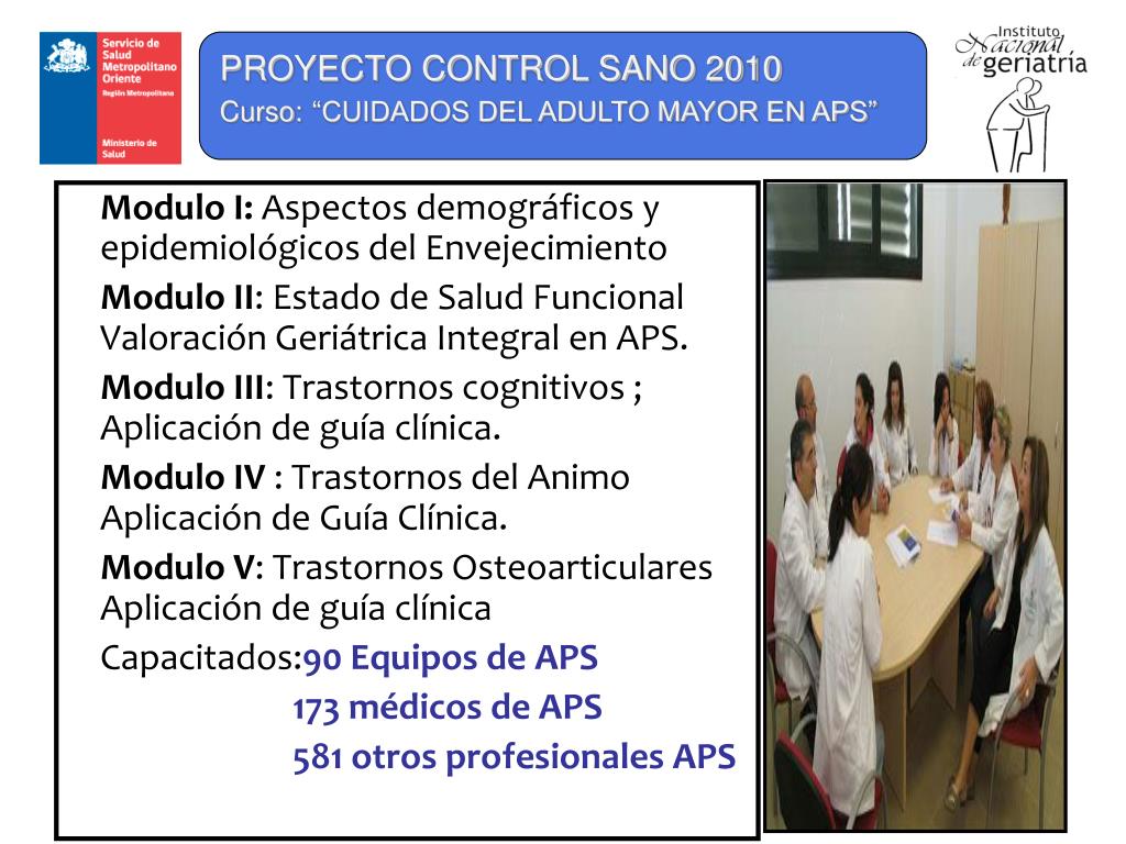 PROYECTO CONTROL SANO 2010 Curso:“CUIDADOS DEL ADULTO MAYOR EN APS” Modulo I: Aspectos demográficos y epidemiológicos del Envejecimiento Modulo II: Estado de Salud Funcional Valoración Geriátrica Integral en APS. Modulo III: Trastornos cognitivos ; Aplicación de guía clínica. Modulo IV : Trastornos del Animo Aplicación de Guía Clínica. Modulo V: Trastornos Osteoarticulares Aplicación de guía clínica Capacitados:90 Equipos de APS 173 médicos de APS 581 otros profesionales APS