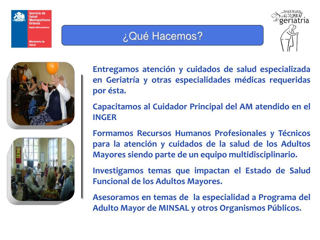 ¿Qué Hacemos? Entregamos atención y cuidados de salud especializada en Geriatría y otras especialidades médicas requeridas por ésta. Capacitamos al Cuidador Principal del AM atendido en el INGER Formamos Recursos Humanos Profesionales y Técnicos para la atención y cuidados de la salud de los Adultos Mayores siendo parte de un equipo multidisciplinario. Investigamos temas que impactan el Estado de Salud Funcional de los Adultos Mayores. Asesoramos en temas de la especialidad a Programa del Adulto Mayor de MINSAL y otros Organismos Públicos.