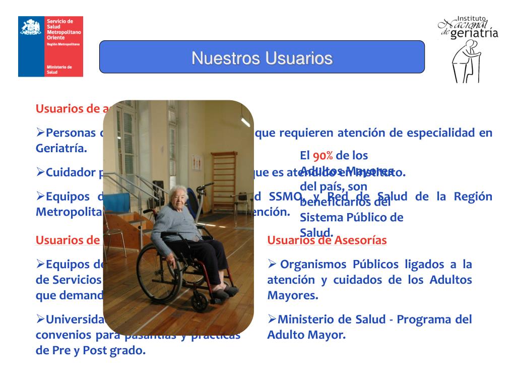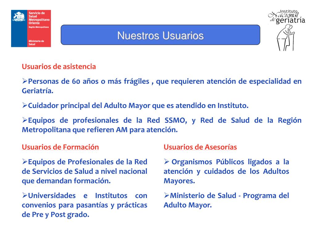 Nuestros Usuarios Usuarios de asistencia • Personas de 60 años o más frágiles , que requieren atención de especialidad en Geriatría. • Cuidador principal del Adulto Mayor que es atendido en Instituto. • Equipos de profesionales de la Red SSMO, y Red de Salud de la Región Metropolitana que refieren AM para atención. Usuarios de Formación • Equipos de Profesionales de la Red de Servicios de Salud a nivel nacional que demandan formación. • Universidades e Institutos con convenios para pasantías y prácticas de Pre y Post grado. Usuarios de Asesorías • Organismos Públicos ligados a la atención y cuidados de los Adultos Mayores. • Ministerio de Salud - Programa del Adulto Mayor.