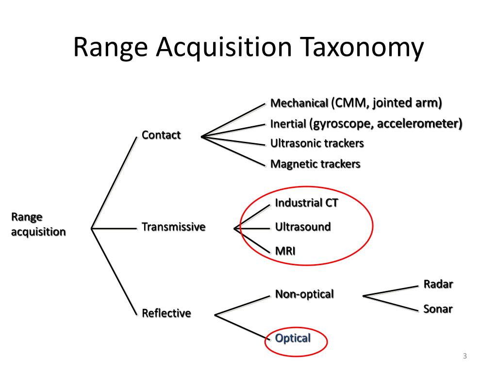 Range Acquisition Taxonomy Mechanical (CMM, jointed arm) Inertial (gyroscope, accelerometer) Contact Ultrasonic trackers Magnetic trackers Industrial CT Rangeacquisition Transmissive Ultrasound MRI Radar Non-optical Sonar Reflective Optical