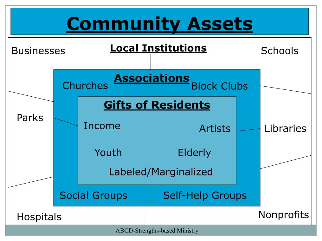 Community Assets Local Institutions Businesses Schools Associations Churches Block Clubs Gifts of Residents Parks Income Artists Libraries Youth Elderly Labeled/Marginalized Social Groups Self-Help Groups Nonprofits Hospitals ABCD-Strengths-based Ministry