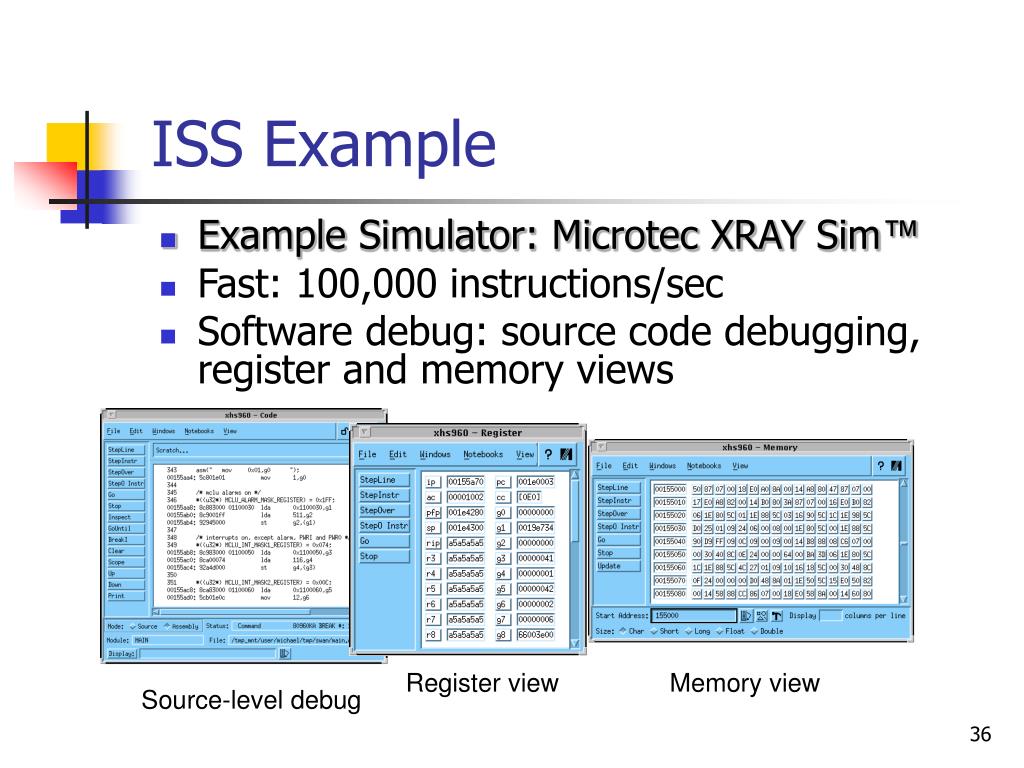 Register view Memory view Source-level debug ISS Example • Example Simulator: Microtec XRAY Sim™ • Fast: 100,000 instructions/sec • Software debug: source code debugging, register and memory views