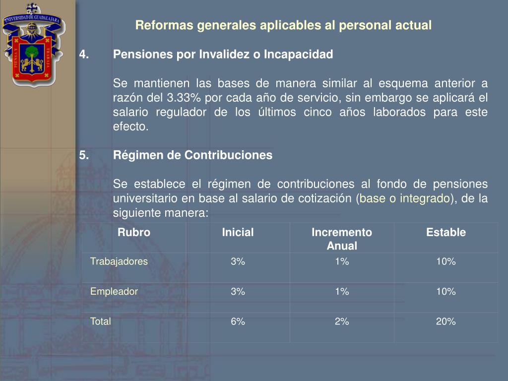 Rubro Inicial Incremento Anual Estable Trabajadores 3% 1% 10% Empleador 3% 1% 10% Total 6% 2% 20% • Reformas generalesaplicables al personal actual • Pensiones por Invalidez o Incapacidad • Se mantienen las bases de manera similar al esquema anterior a razón del 3.33% por cada año de servicio, sin embargo se aplicará el salario regulador de los últimos cinco años laborados para este efecto. • Régimen de Contribuciones • Se establece el régimen de contribuciones al fondo de pensiones universitario en base al salario de cotización (base o integrado), de la siguiente manera: