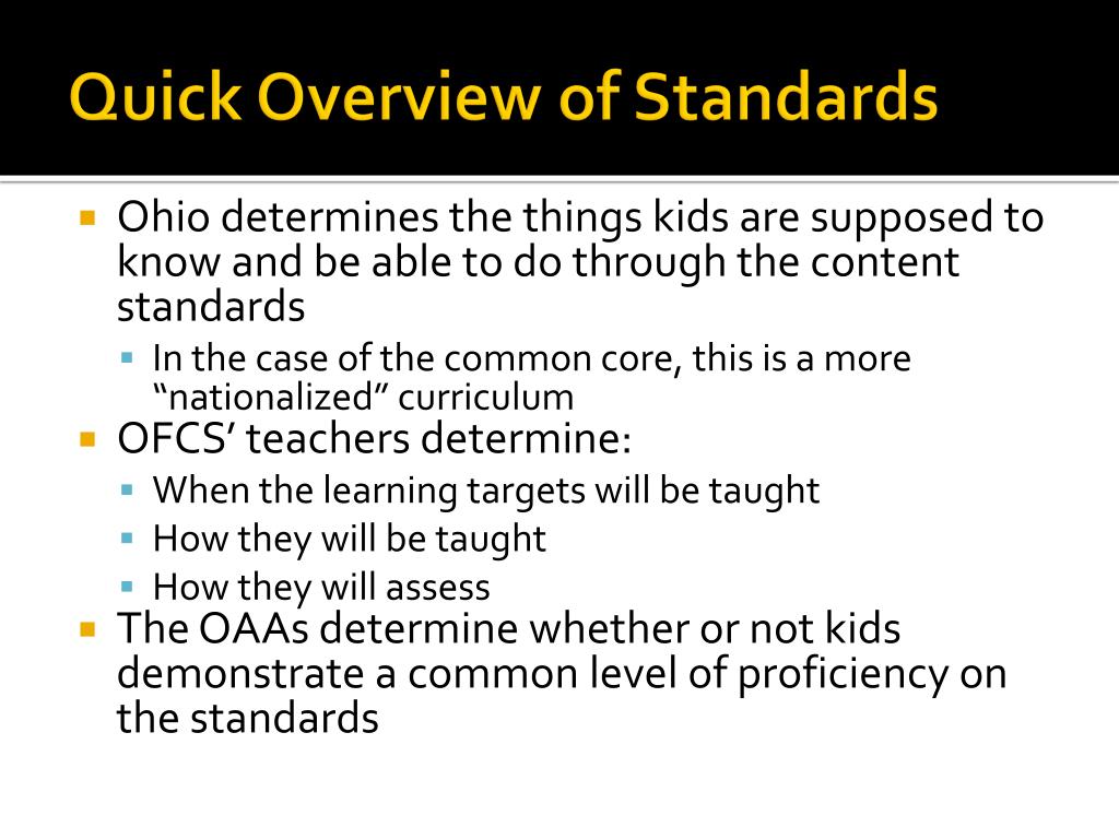 Quick Overview of Standards • Ohio determines the things kids are supposed to know and be able to do through the content standards • In the case of the common core, this is a more “nationalized” curriculum • OFCS’ teachers determine: • When the learning targets will be taught • How they will be taught • How they will assess • The OAAs determine whether or not kids demonstrate a common level of proficiency on the standards