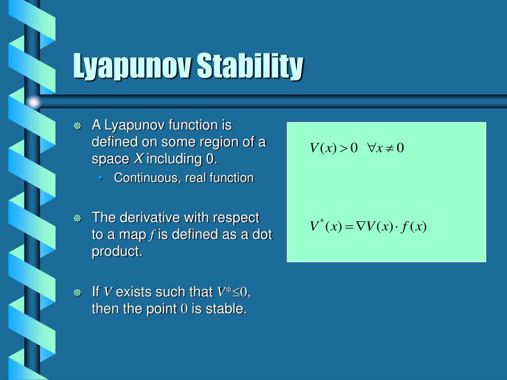 A Lyapunov function is defined on some region of a space X including 0. Continuous, real function The derivative with respect to a map f is defined as a dot product. If V exists such that V*0, then the point 0 is stable. Lyapunov Stability