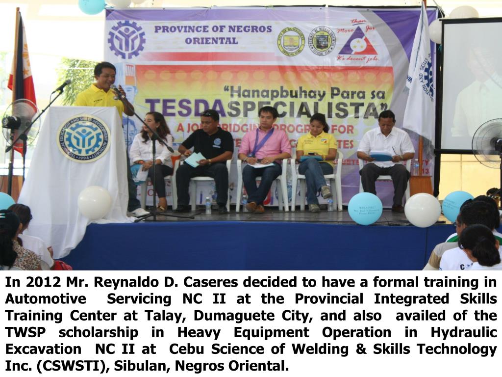 In 2012 Mr. Reynaldo D. Caseres decided to have a formal training in Automotive Servicing NC II at the Provincial Integrated Skills Training Center at Talay, Dumaguete City, and also availed of the TWSP scholarship in Heavy Equipment Operation in Hydraulic Excavation NC II at Cebu Science of Welding & Skills Technology Inc. (CSWSTI), Sibulan, Negros Oriental.