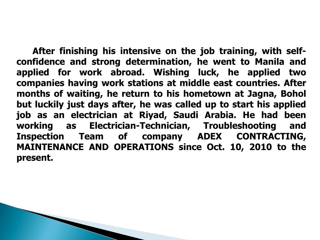 After finishing his intensive on the job training, with self-confidence and strong determination, he went to Manila and applied for work abroad. Wishing luck, he applied two companies having work stations at middle east countries. After months of waiting, he return to his hometown at Jagna, Bohol but luckily just days after, he was called up to start his applied job as an electrician at Riyad, Saudi Arabia. He had been working as Electrician-Technician, Troubleshooting and Inspection Team of company ADEX CONTRACTING, MAINTENANCE AND OPERATIONS since Oct. 10, 2010 to the present.