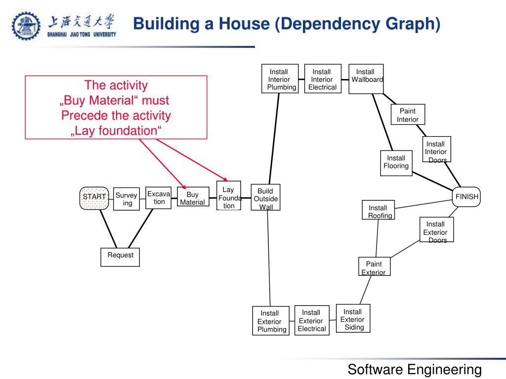 The activity „Buy Material“ must Precedetheactivity „Lay foundation“ Building a House (Dependency Graph) Install Install Install Interior Interior Wallboard Plumbing Electrical Paint Interior Install Interior Install Doors Flooring Lay Build Excava Buy Survey START FINISH Founda Outside tion Material ing tion Wall Install Roofing Install Exterior Doors Request Paint Exterior Install Install Install Exterior Exterior Exterior Siding Electrical Plumbing
