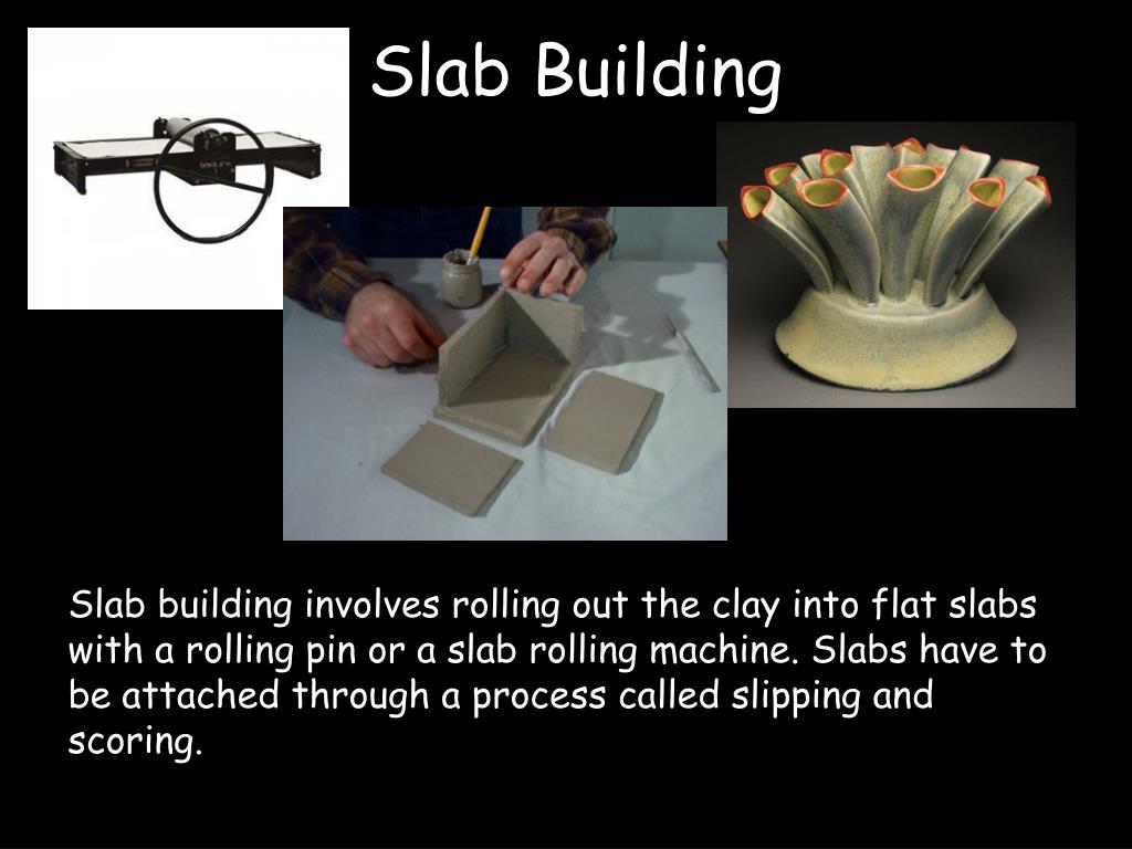 Slab Building Slab building involves rolling out the clay into flat slabs with a rolling pin or a slab rolling machine. Slabs have to be attached through a process called slipping and scoring.