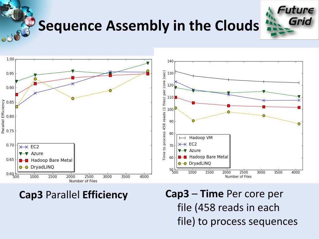 Sequence Assembly in the Clouds Cap3 Parallel Efficiency Cap3– Time Per core per file (458 reads in each file) to process sequences