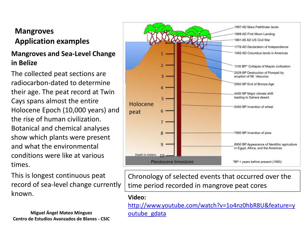 MangrovesApplicationexamples Mangroves and Sea-Level Change in Belize The collected peat sections are radiocarbon-dated to determine their age. The peat record at Twin Cays spans almost the entire Holocene Epoch (10,000 years) and the rise of human civilization. Botanical and chemical analyses show which plants were present and what the environmental conditions were like at various times. This is longest continuous peat record of sea-level change currently known. Chronology of selected events that occurred over the time period recorded in mangrove peat cores Video: http://www.youtube.com/watch?v=1o4nz0hbR8U&feature=youtube_gdata Miguel Ángel Mateo Mínguez Centro de Estudios Avanzados de Blanes - CSIC