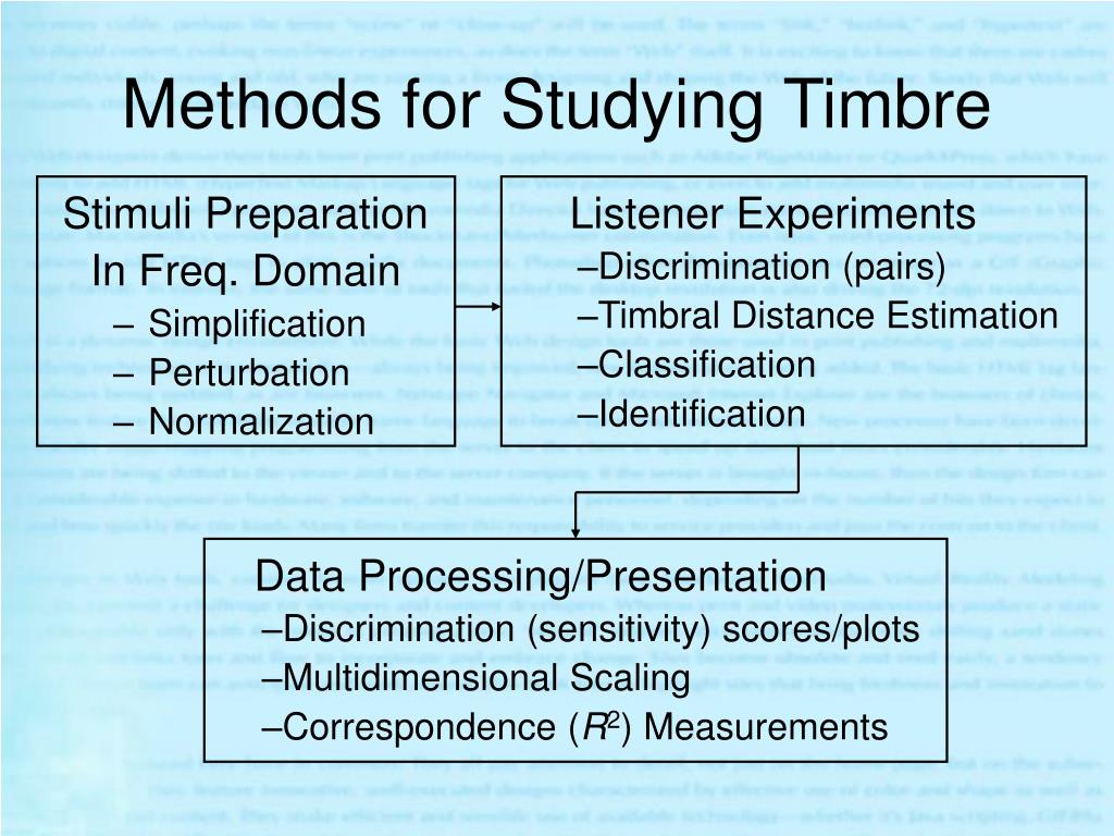 Methods for Studying Timbre • Listener Experiments • Discrimination (pairs) • Timbral Distance Estimation • Classification • Identification Stimuli Preparation In Freq. Domain • Simplification • Perturbation • Normalization • Data Processing/Presentation • Discrimination (sensitivity) scores/plots • Multidimensional Scaling • Correspondence (R2) Measurements