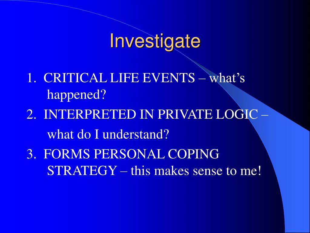 Investigate 1. CRITICAL LIFE EVENTS – what’s happened? 2. INTERPRETED IN PRIVATE LOGIC – what do I understand? 3. FORMS PERSONAL COPING STRATEGY – this makes sense to me!