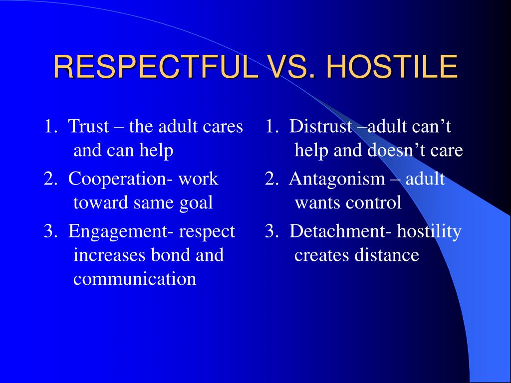 1. Trust – the adult cares and can help 2. Cooperation- work toward same goal 1. Distrust –adult can’t help and doesn’t care 2. Antagonism – adult wants control RESPECTFUL VS. HOSTILE