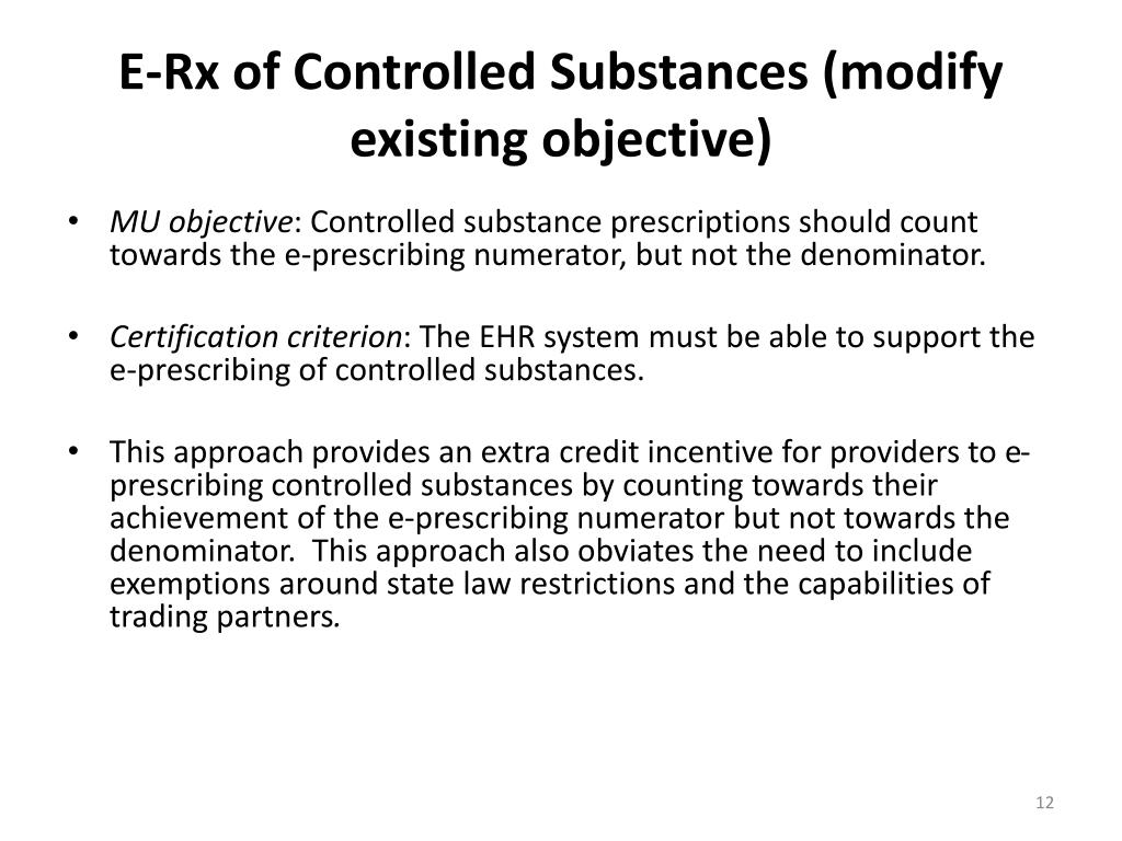 E-Rx of Controlled Substances (modify existing objective) • MU objective: Controlled substance prescriptions should count towards the e-prescribing numerator, but not the denominator. • Certification criterion: The EHR system must be able to support the e-prescribing of controlled substances. • This approach provides an extra credit incentive for providers to e-prescribing controlled substances by counting towards their achievement of the e-prescribing numerator but not towards the denominator. This approach also obviates the need to include exemptions around state law restrictions and the capabilities of trading partners.