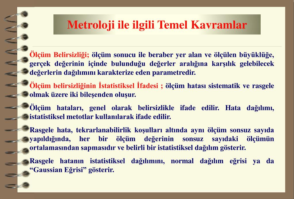 Metroloji ile ilgili Temel Kavramlar Ölçüm Belirsizliği;ölçüm sonucu ile beraber yer alan ve ölçülen büyüklüğe, gerçek değerinin içinde bulunduğu değerler aralığına karşılık gelebilecek değerlerin dağılımını karakterize eden parametredir. Ölçüm belirsizliğinin İstatistiksel İfadesi ;ölçüm hatası sistematik ve rasgele olmak üzere iki bileşenden oluşur. Ölçüm hataları, genel olarak belirsizlikle ifade edilir. Hata dağılımı, istatistiksel metotlar kullanılarak ifade edilir. Rasgele hata, tekrarlanabilirlik koşulları altında aynı ölçüm sonsuz sayıda yapıldığında, her bir ölçüm değerinin sonsuz sayıdaki ölçümün ortalamasından sapmasıdır ve belirli bir istatistiksel dağılım gösterir. Rasgele hatanın istatistiksel dağılımını, normal dağılım eğrisi ya da “Gaussian Eğrisi” gösterir.