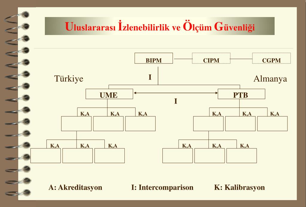 BIPM CIPM CGPM UME PTB I Türkiye Almanya I K,A K,A K,A K,A K,A K,A K,A K,A K,A K,A K,A K,A A: Akreditasyon I: Intercomparison K: Kalibrasyon Uluslararası İzlenebilirlik ve Ölçüm Güvenliği