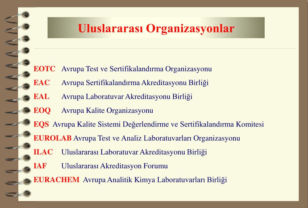 Uluslararası Organizasyonlar EOTCAvrupa Test ve Sertifikalandırma Organizasyonu EACAvrupa Sertifikalandırma Akreditasyonu Birliği EALAvrupa Laboratuvar Akreditasyonu Birliği EOQAvrupa Kalite Organizasyonu EQSAvrupa Kalite Sistemi Değerlendirme ve Sertifikalandırma Komitesi EUROLABAvrupa Test ve Analiz Laboratuvarları Organizasyonu ILAC Uluslararası Laboratuvar Akreditasyonu Birliği IAF Uluslararası Akreditasyon Forumu EURACHEM Avrupa Analitik Kimya Laboratuvarları Birliği