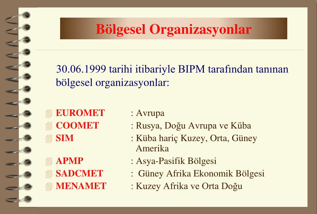 Bölgesel Organizasyonlar 30.06.1999 tarihi itibariyle BIPM tarafından tanınan bölgesel organizasyonlar: • EUROMET: Avrupa • COOMET : Rusya, Doğu Avrupa ve Küba • SIM : Küba hariç Kuzey, Orta, Güney Amerika • APMP : Asya-Pasifik Bölgesi • SADCMET: Güney Afrika Ekonomik Bölgesi • MENAMET : Kuzey Afrika ve Orta Doğu