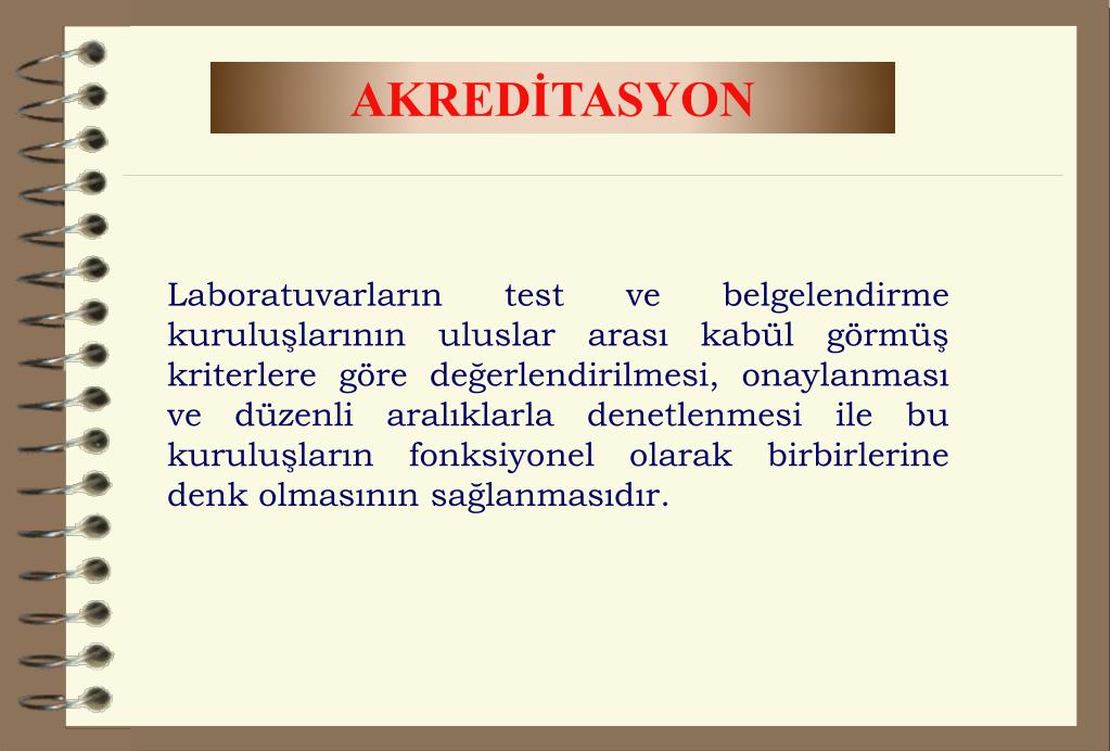 AKREDİTASYON Laboratuvarların test ve belgelendirme kuruluşlarının uluslar arası kabül görmüş kriterlere göre değerlendirilmesi, onaylanması ve düzenli aralıklarla denetlenmesi ile bu kuruluşların fonksiyonel olarak birbirlerine denk olmasının sağlanmasıdır.