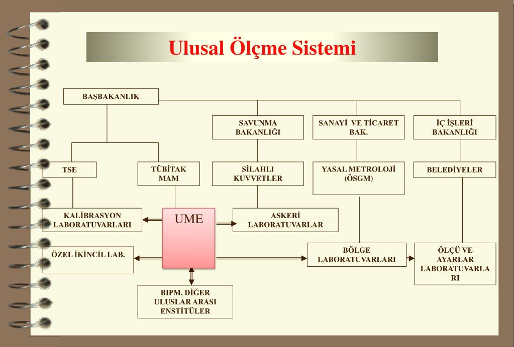 SİLAHLI KUVVETLER SAVUNMA BAKANLIĞI SANAYİ VE TİCARET BAK. YASAL METROLOJİ (ÖSGM) İÇ İŞLERİ BAKANLIĞI BELEDİYELER Ulusal Ölçme Sistemi BAŞBAKANLIK TSE TÜBİTAK MAM KALİBRASYON LABORATUVARLARI UME ASKERİ LABORATUVARLAR BÖLGE LABORATUVARLARI ÖLÇÜ VE AYARLAR LABORATUVARLARI ÖZEL İKİNCİL LAB. BIPM, DİĞER ULUSLAR ARASI ENSTİTÜLER