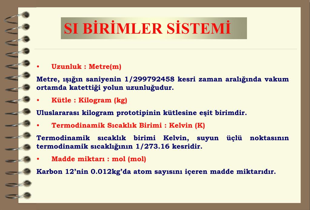 SI BİRİMLER SİSTEMİ • Uzunluk : Metre(m) Metre, ışığın saniyenin 1/299792458 kesri zaman aralığında vakum ortamda katettiği yolun uzunluğudur. • Kütle : Kilogram (kg) • Uluslararası kilogram prototipinin kütlesine eşit birimdir. • Termodinamik Sıcaklık Birimi : Kelvin (K) • Termodinamik sıcaklık birimi Kelvin, suyun üçlü noktasının termodinamik sıcaklığının 1/273.16 kesridir. • Madde miktarı : mol (mol) • Karbon 12’nin 0.012kg’da atom sayısını içeren madde miktarıdır.